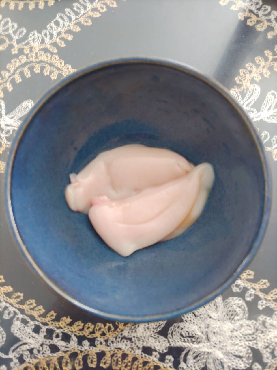 昨日のタイに入っていた発展途上の白子です。師匠格釣友からのアドバイスが以下です。↓ 以下はアドバイス ↓白子をさっと湯通しして裏ごしし、皮つきで湯引きしたタイを1cm角に切って、白子と味噌とネギと大葉でなめろう(混ぜるだけで叩かなくてよい)にして、白ごまをかけていただくと美味しいです。