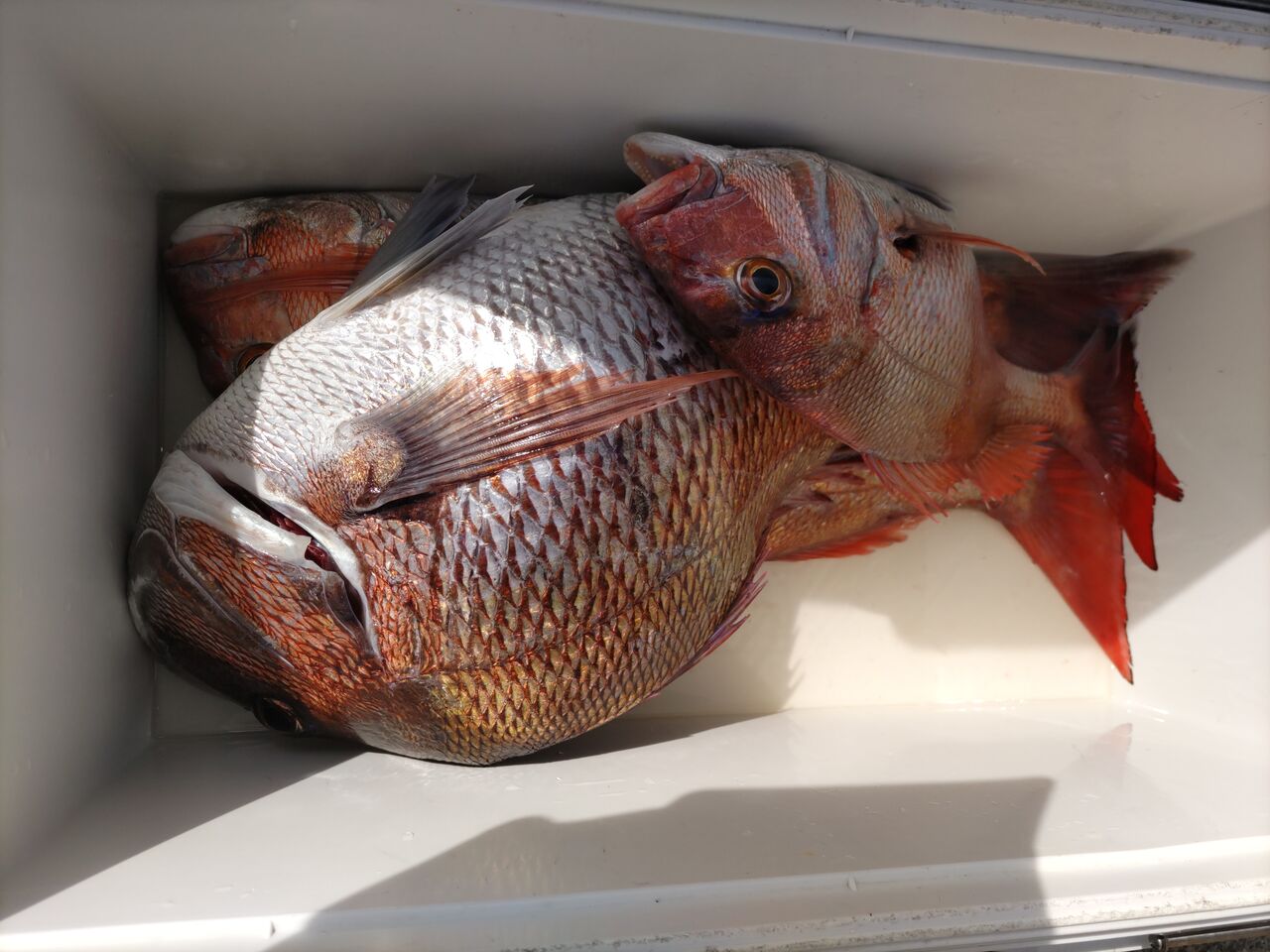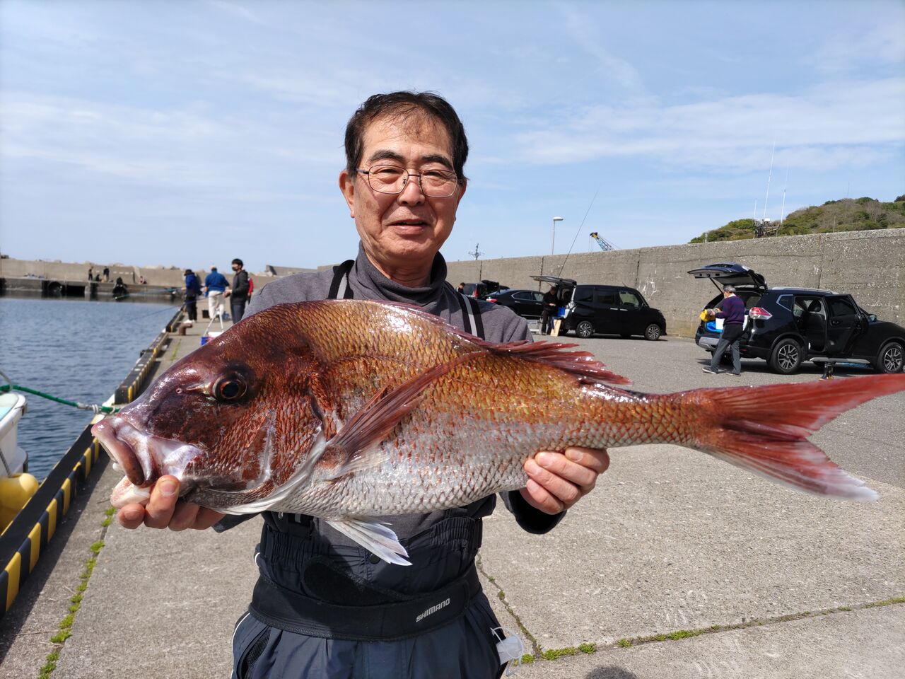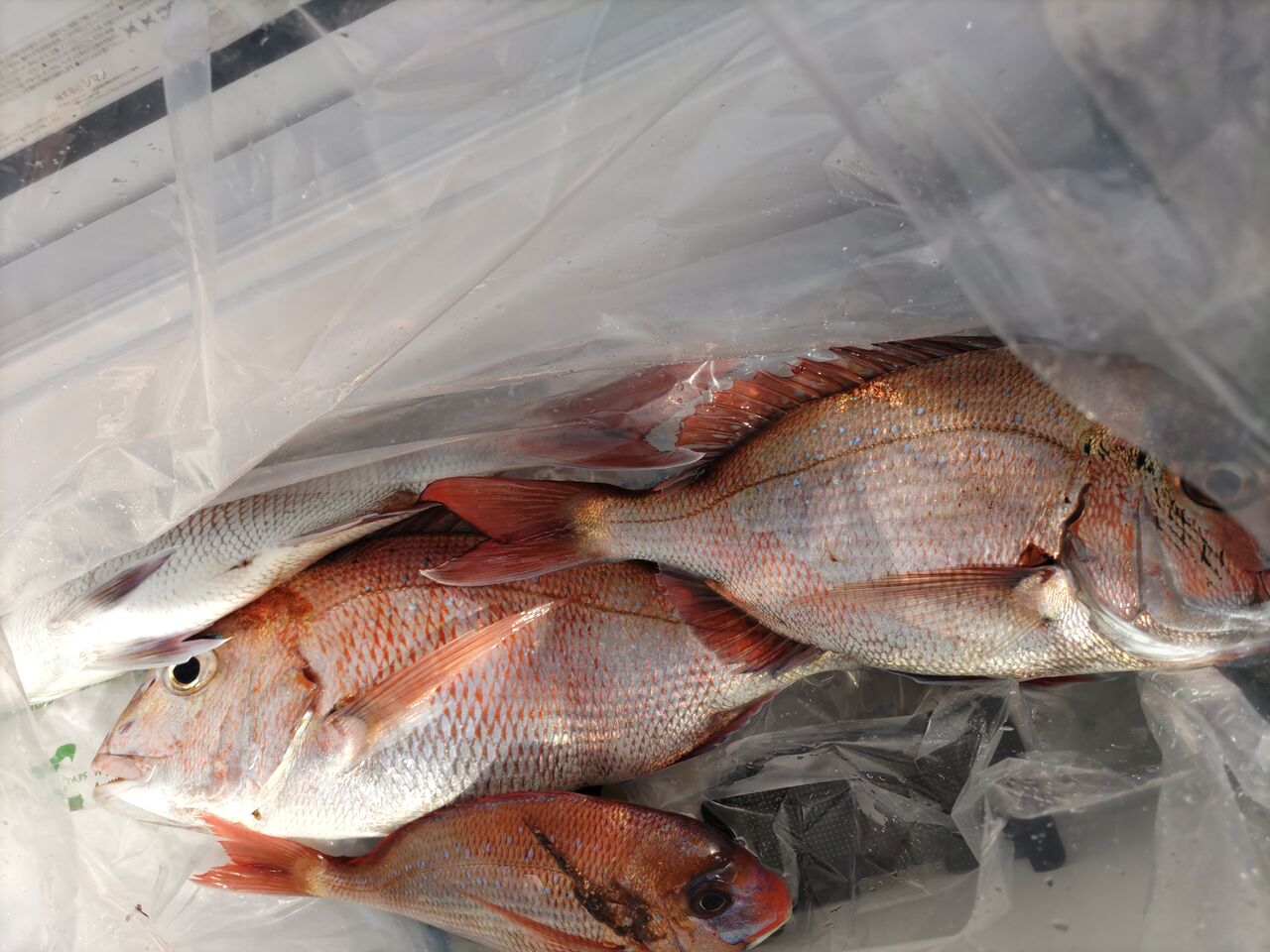 コマセマダイ 2023年04月29日 10人のお客さんと一日便でした。マダイ 0.5~3.9kg お一人1~4枚他にハナダイが釣れました。何とか皆さん顔を見ていただけました。まだ反応はそんなに本格的ではありませんが、それでも少しは釣れてくれましたね。何枚かバレたんですけど、今の時期、皮1枚のフッキングとかあるのであんまり無理しないでくださいね。早アワセも禁物ですよ。 < 前の記事次の記事 >