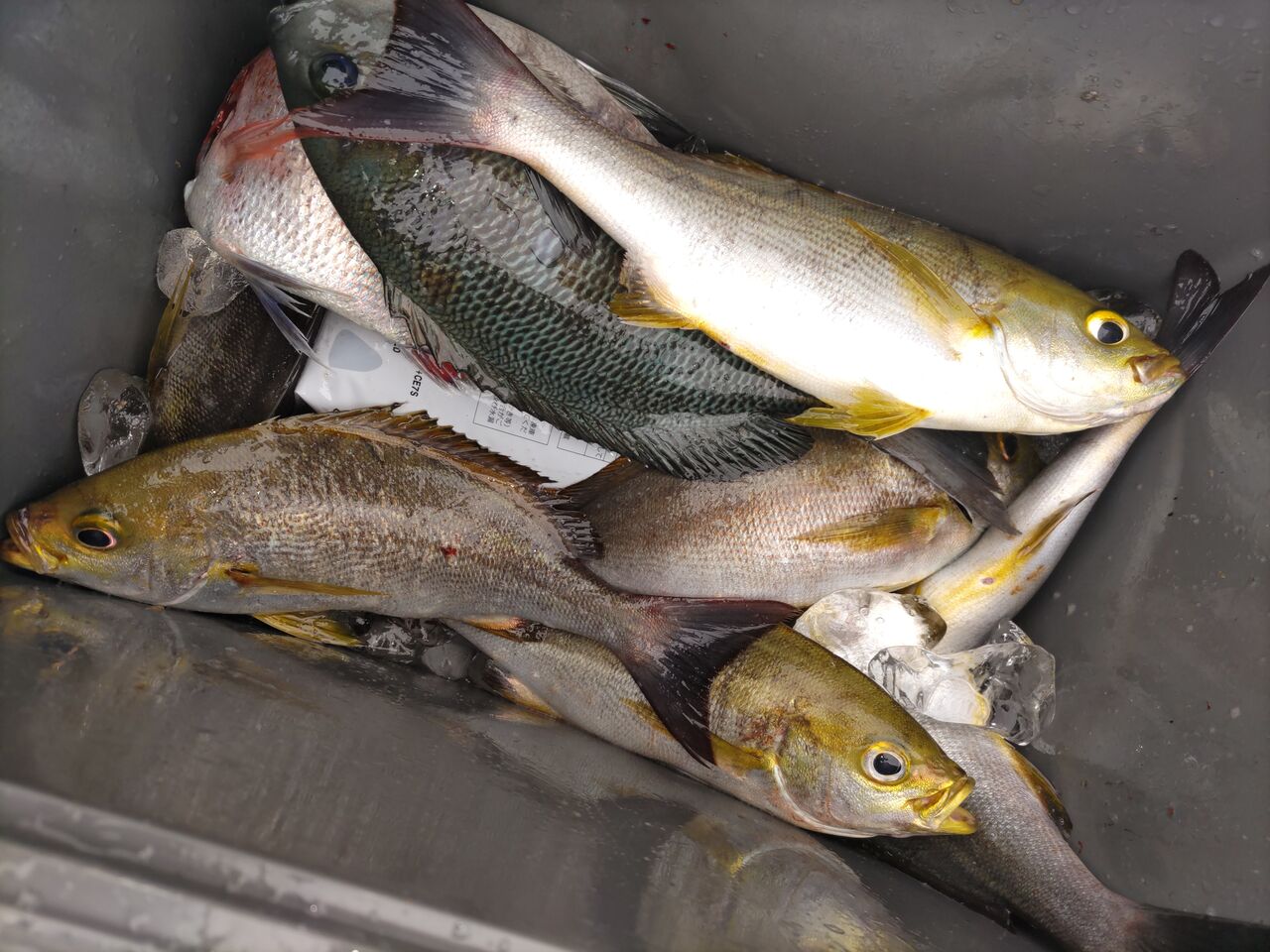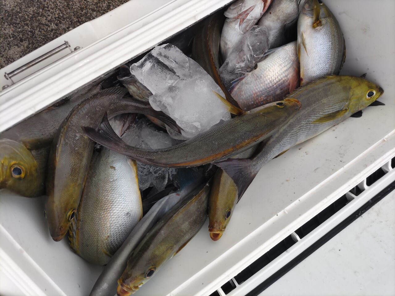 ムギイカ+フカセ五目 2023年07月05日 お二人のお客さんと一日便でした。スルメイカ お一人0~1ハイ他にサバが釣れました。今日はもう今シーズン一番ダメでした。ごめんなさい。他にも数回アタリはあったようですが、乗らないか途中でバレたそうです。7月に入って底引き漁は禁漁に入ったので、だいぶ自由に攻められたのですが…今年は弱りました。今日はサバが多かったです。しかもベタ底でなので、着ノリかと思ったらサバでした。先日マダラ釣りの時にマグロを見かけたので、サバも底に張り付いているのかも知れませんね。フカセ五目の方は、イサキ お一人10匹以上 (ただし小型はリリースしてくださったみたいです)他にメジナ、ハナダイ、マダイが釣れました。 < 前の記事次の記事 >