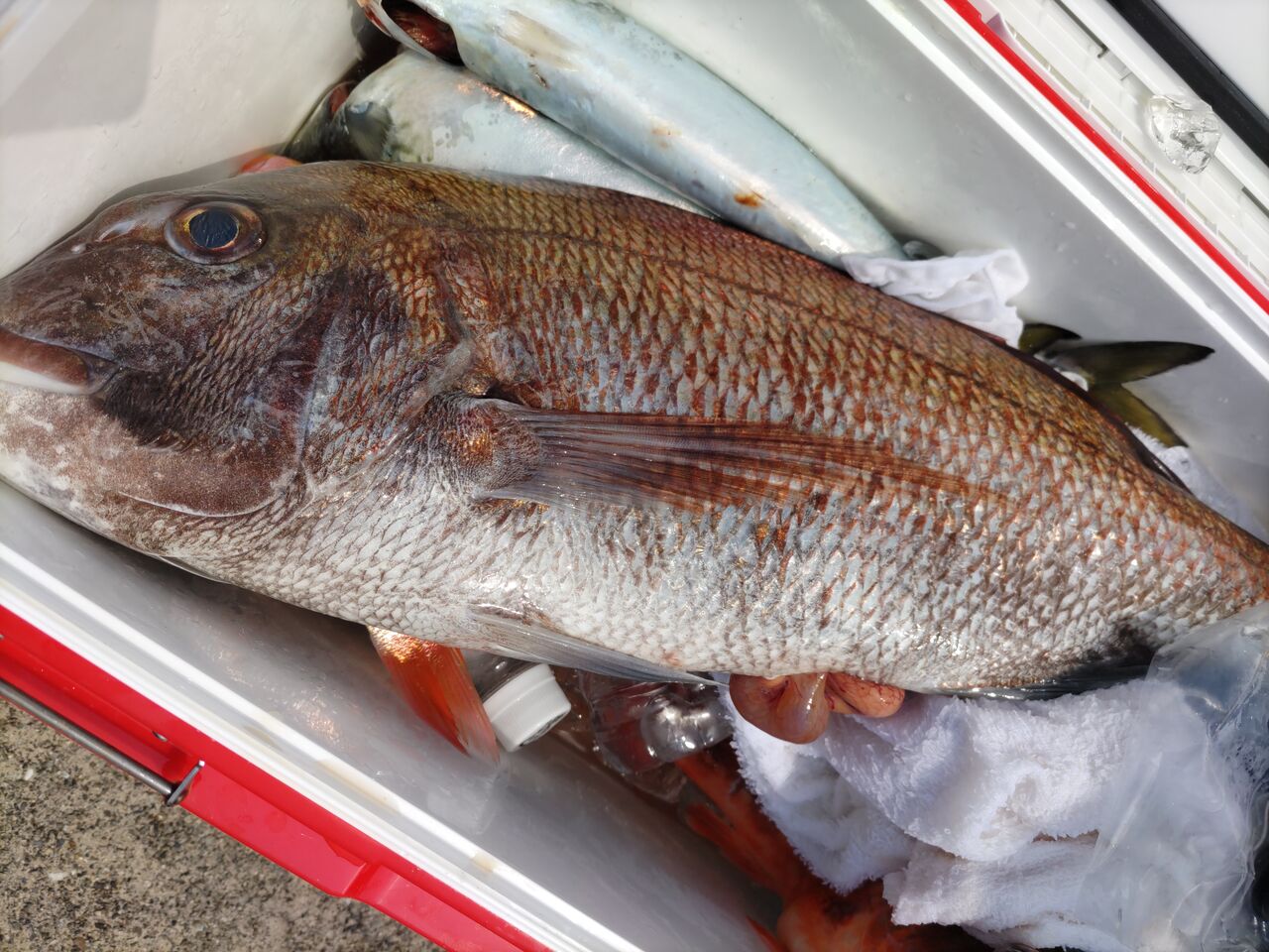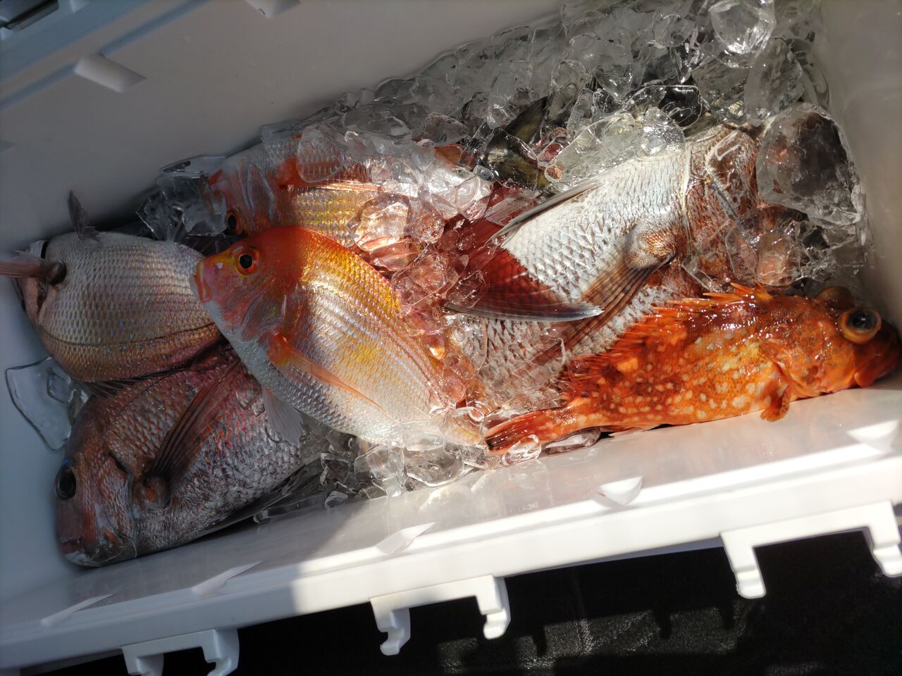ひとつテンヤ 2023年07月25日 6人のお客さんと一日便でした。マダイ 0.8~2.7kg お一人1~3枚他にアジ、サバ、レンコダイ、ウッカリカサゴ、オニカサゴが釣れました。数はそうでもありませんが、何はともあれ皆さん顔を見ていただけてよかったです。今日はベタ底でのアタリが多かったようです。一度だけ底から40m上でのキャッチもありました。実は序盤かなり大きいのが当たったのですが残念ながらラインブレイクでした。かなり引いてなかなか寄ってこなくて、でも青物ではなさそうな感じだったし、ホントに残念でしたね。上には書いてませんけど、エソも多かったですしかもデカい < 前の記事次の記事 >