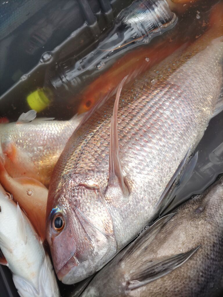 ひとつテンヤ 2024年08月23日 7人のお客様と1日便でした。 フェーン現象で、多分今日は今シーズン一番暑かっただろうと思います🥵今までなかなか猛暑日まではいかなかったけど、今日はいったかもしれません。 マダイ 1キロ前後 お一人0〜1枚 他にレンコダイ、キジハタ、クロソイ、カサゴが釣れました。 マダイは2枚でした。 1か所、時々底付近に単発の反応が出る場所があったけど、粘ってもどうにも食ってこなかったです。 外道のアタリもいつもより出にくかったですね。 < 前の記事次の記事 >